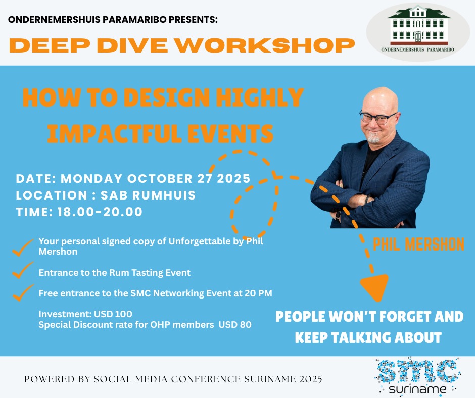 Deze sessie geeft je concrete tools, frisse inspiratie en een exclusief netwerk van gelijkgestemden binnen de Surinaamse event- en communicatiesector.